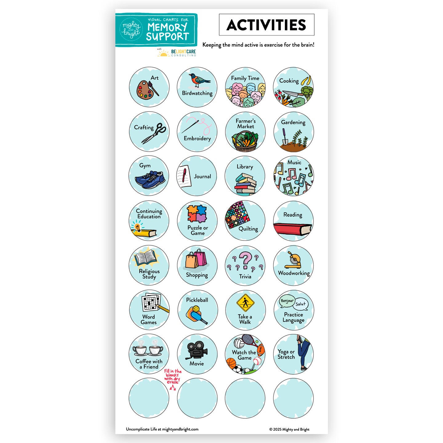 Help your loved one stay independent, longer, with visual charts designed specifically to support early-stage dementia and Alzheimer’s.